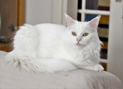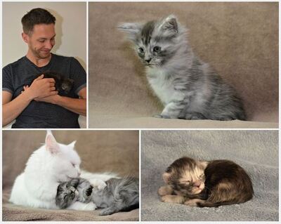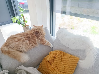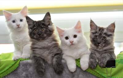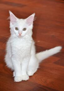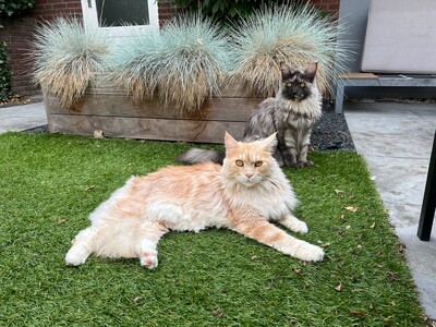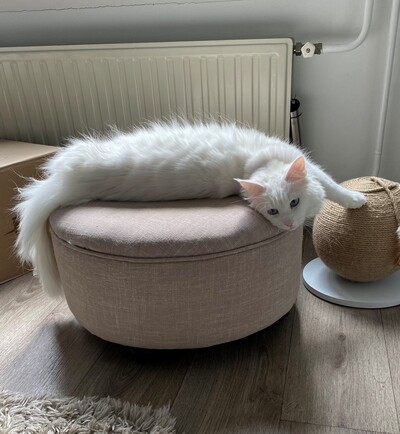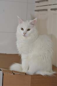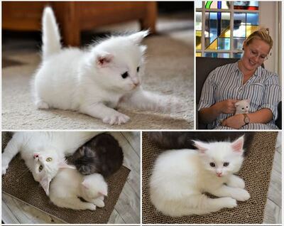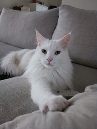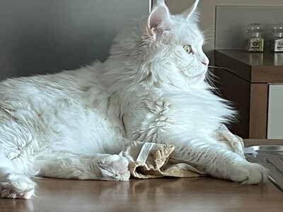 Mariska & Jean: “Een jaartje nadat we Izzy hadden, wilden we graag een 2e kat. We dachten dat de twee katten elkaar gezelschap zouden kunnen houden. Het M-nest kwam eraan en wij gaven al snel aan dat we interesse hadden. In eerste instantie hadden we het leuk gevonden om een volledige witte Maine Coon te hebben. Die zien er gewoon super mooi en imposant uit. Toen we voor de eerste keer het nestje kwamen bezoeken, stapten we er wel open in. Want er moet natuurlijk ook een klik met de kat zijn. We zochten contact met alle vier de katten. Moa was degene die meermaals ons uit zichzelf kwam opzoeken. Ze bleef zelfs slapen op de schoot van Mariska. Wij hadden niet de kat gekozen, Moa had ons gekozen.