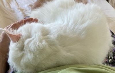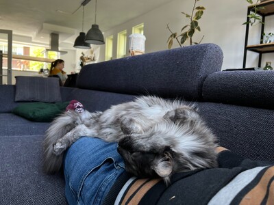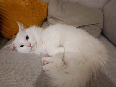 Snow heeft wel heel snel zijn plaats in ons gezin gevonden. Hij is een echte knuffellaar die graag op je schoot of buik komt liggen. Zo hebben we dus al heel veel tijd samen op de zetel doorgebracht. Hij is ook heel graag bij ons en komt ook steeds in de ruimte liggen waar wij ook zijn.
