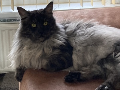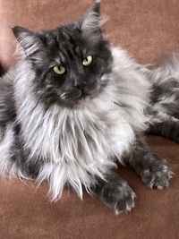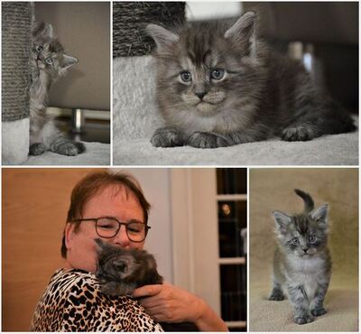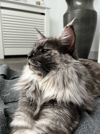 Van het kleine zwarte katertje is maar weinig meer over. Zelfs in de zomer is hij een grote, ontplofte wolbaal die wel erg wit is voor een zwarte kat. Hij heeft goed type, grove boning en is alles wat een Maine Coon kater moet zijn. Het is erg jammer dat zijn heupen niet goed zijn en hij geen nestje heeft kunnen verwekken. Maar gelukkig heeft hij (nog) geen last van zijn heupen, hij springt hoog en makkelijk en is actief genoeg.”