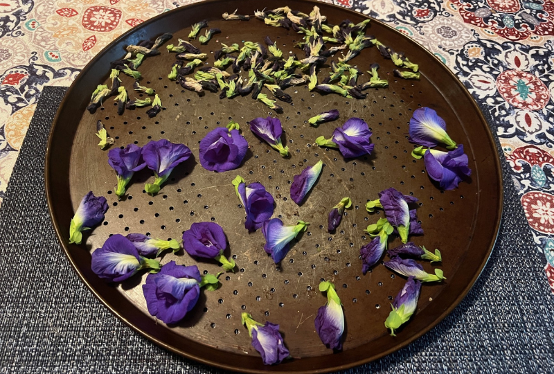 During our travels in Thailand a couple of years ago, we encountered the most beautiful tea brewed from the Butterfly Pea flower—Clitoria ternatea. When the flowers are steeped in hot water, they release a beautiful blue — the color drawn from its anthocyanin pigment called ternatin. Add a slice of lemon and it transforms the deep indigo into a delicate violet. When we added honey, it turned into a dark purple!