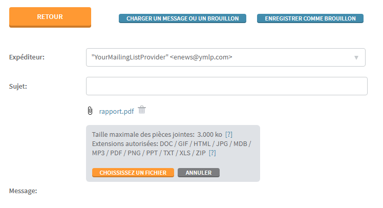 Lors de la deuxième étape (Message) de l'assistant "Composer Newsletter", cliquez sur le lien "Joindre un fichier" situé sous le champ de la ligne de sujet.