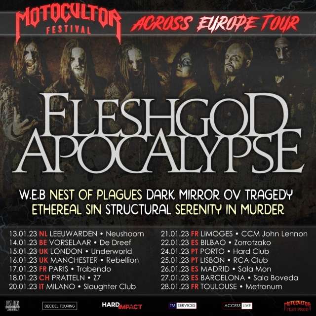 L'année 2023 commence fort avec de nombreux concerts annoncés en tout genres. La tournée Motocultor Festival Across Europe Tour 2023, avec Fleshgod Apocalypse arrive en France dès le 17 janvier ! Nous retrouverons également des artistes tel que Twilight Force, Soilwork, The New Roses, Les Tambours du Bronx, Shaârghot, Deströyer 666, Rhapsody of Fire, Igorrr, Amenra, Les Fatals Picards, etc.