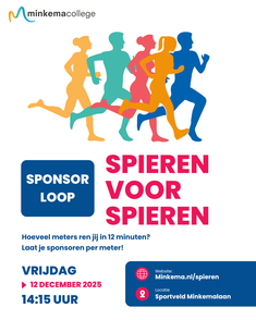 Op vrijdag 12 december organiseren we een sponsorloop ten behoeve van Spieren voor Spieren. Jullie kunnen deze dag geld ophalen voor dit goede doel, dat zich inzet voor kinderen met een spierziekte en dit jaar ook door 3FM Serious Request wordt gesteund. De sponsorloop vindt plaats op ons eigen sportveld.