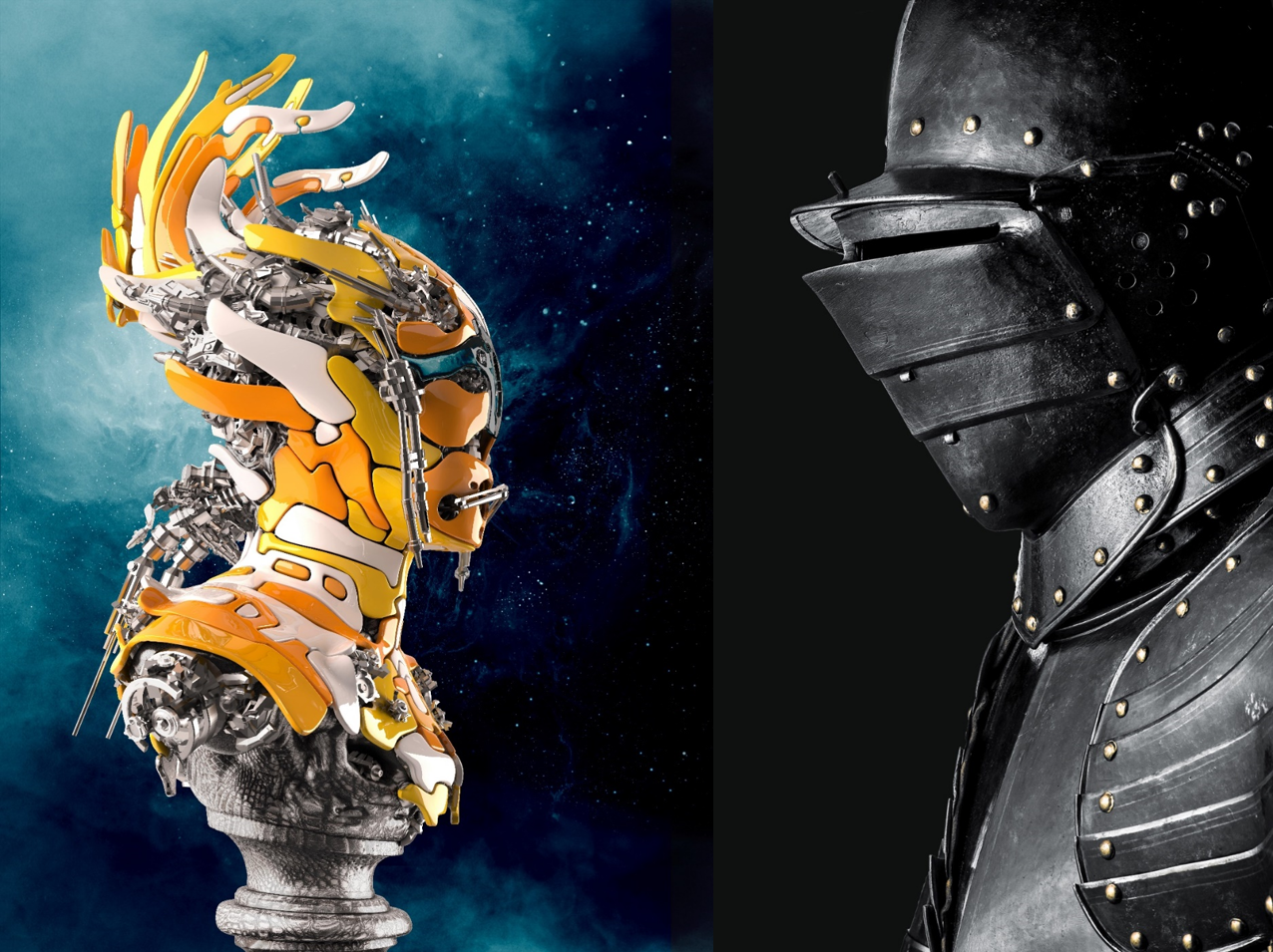 Ervinck’s cyrborg-like sculptures combine historical imagery with modern technology. The works engage in dialogue with the historical environs and objects of the castle: for example, the contrast between the sculptures and the castle’s suits of armour challenges visitors to ponder the evolution of technology. Cyborgs meet knights!