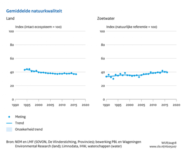 Sinds 1994 is de gemiddelde kwaliteit van alle typen landnatuur achteruitgegaan. De daling van de gemiddelde ecosysteemkwaliteit in natuurgebieden op het land is gestopt. De laatste jaren neemt de gemiddelde natuurkwaliteit van ecosystemen niet verder af maar ook niet duidelijk toe. In vergelijking met de trend op het land is de trend voor natuurkwaliteit in het zoete water de afgelopen decennia gemiddeld positiever. Lees meer op Groene Hart Media