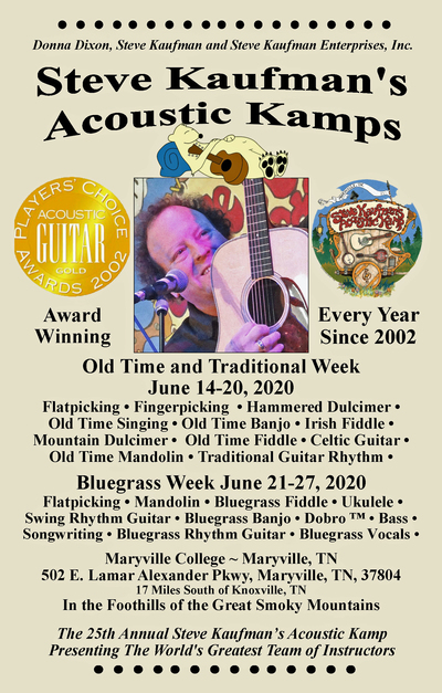 The Kamp Brochure for the big 25th Annual Steve Kaufman'a Acoustic Kamp is back from the printers. You can see the Full Color web version and DOWNLOAD it Now!