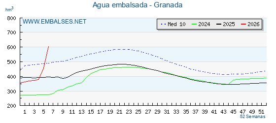 In de grafiek zie je dat de rode lijn boven het gemiddelde van de afgelopen 10 jaar komt. Het is echt heel uitzonderlijk dat er al zoveel water in de stuwmeren zit. Genoeg om het land in de provincie Granada en omstreken twee jaar lang van water te voorzien.