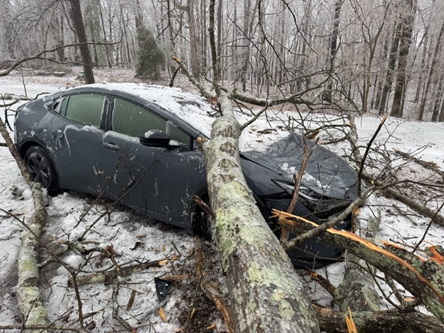 Like the one that landed on my car. The car was not parked close to the woods and the tree that fell was not near the edge of the woods. But we do have some big, tall trees, tall enough so that the top of it still slammed into our car, breaking or bending just about every surface front to back. It took out both windshields and bent their supports, bent the driver's side door, the hood and tore off the bumper. We’re still waiting to find out if the insurance will say it’s totaled.