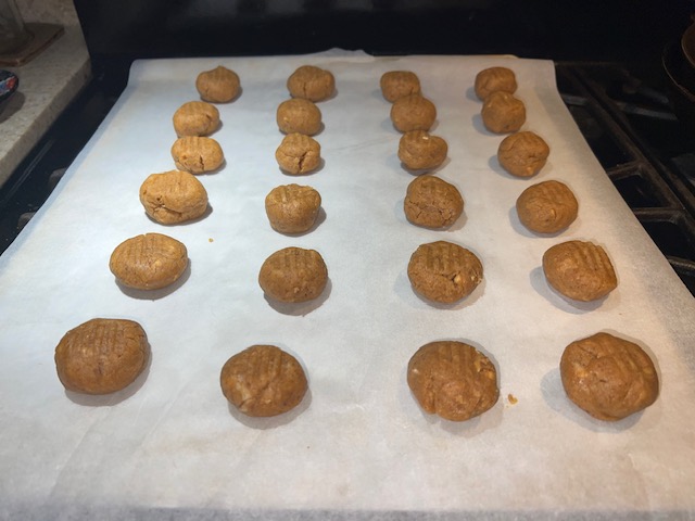 Roll the dough into small balls and place on a cookie sheet. Don't forget to press a fork into the top to give them the classic peanut butter cookie look!