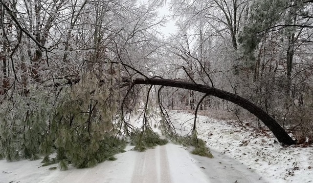 The pattern of rain and freezing continues, forming coat after coat until the smallest twig can have a circle of ice 1/2 to 1 inch in diameter surrounding it. The ice puts a lot of weight on the trees, and if their roots are weak, the trees fall...