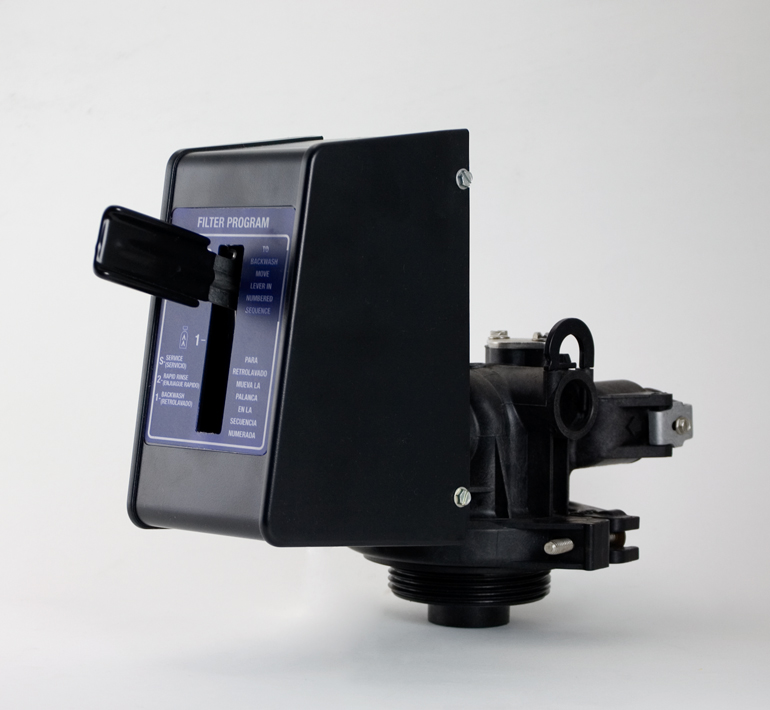This control valve requires no electricity and no programming. It has a three-choice selection lever that send water to the home (Service position), backwashes the filter, or rinses the filter.
