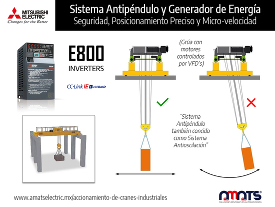 Los variadores de frecuencia de la serie Mitsubishi, tienen ventajas clave para sistemas de grúas o “cranes” industriales; el control de movimiento de carga de esta familia de VFD’s es absoluto, y los convierte en los más eficientes en la mitigación del movimiento de oscilación de peso suspendido, un fenómeno que se conoce como "efecto péndulo".