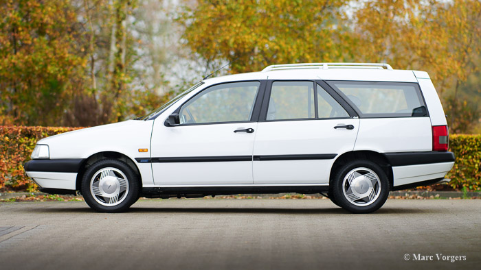 Fiat Tempra SW 2.0 IE SLX 4X4, bouwjaar 1992 (eerste registratie 30 oktober 1992). Exterieurkleur wit (Bianco M.S. 210) gecombineerd met een grijs stoffen/kunstlederen interieur (Velluto Grigio Cassino 160). Deze zeldzame Fiat Tempra 2.0 IE SW 4x4 werd nieuw verkocht aan de heer en mevrouw Kandora uit Appeldorn in Duitsland. Vanaf nieuw heeft deze super originele Fiat slechts 24.678 kilometer gereden. De auto verkeert in een prachtige originele staat; van binnen en van buiten bijna als nieuw! De Fiat Tempra 4x4 was alleen verkrijgbaar als stationwagen (SW of Weekend) en is het zeldzaamste Tempra-model. Er werden er slechts enkele duizenden geproduceerd en de auto's zijn tegenwoordig zeer zeldzaam. Het vierwielaandrijvingssysteem maakte gebruik van een viscokoppeling om indien nodig vermogen over te brengen naar de achterwielen, wat de tractie verbeterde zonder afbreuk te doen aan de dagelijkse bruikbaarheid. Dit goed gedocumenteerde exemplaar verkeert in een bijna perfecte en als nieuwe staat en is zonder twijfel een van de allerbeste die u te koop zult vinden!