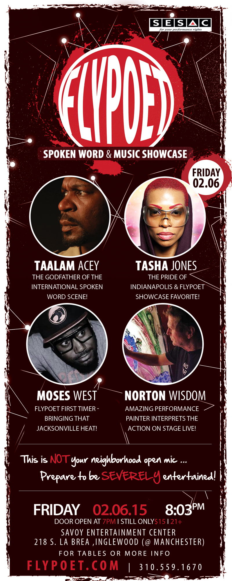 For more than 12 years The Flypoet Spoken Word & Music Showcase has been widely regarded as one of the tightest shows of it's kind in the world. Experience world class poets from all over the country as they bring their "A" game in a tightly produced show laced with high energy live music and live interpretive performance painting. Enjoy great vibes with an amazing audience, have a cocktail, a bite to eat and...