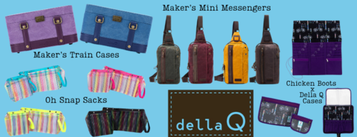 We had a couple custom orders for the Della Q Train Cases and Maker's Mini Messenger bags and we thought they were so fabulous that we needed to stock them in the shop! The train cases are hard sided with the option to attach 2 short handles, a long strap, or both! They have a place to stow your yarn with a yarn guide so you can knit when the case is closed, a tray for your notions and the inside of the lid is magnetic, perfect for holding onto your metal stitch markers and tapestry needles that love to get lost.