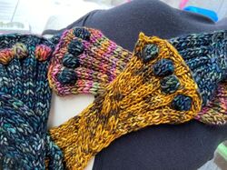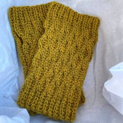 The Woodland Mitts use under 200 yards of sport or DK weight wool and a US F5/3.75mm hook.