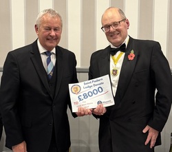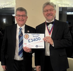 The new master of the Teifi Hallstone Lodge Russell Killick was thrilled to present £3400 to the 2026 Festival Chairman Ryland James.