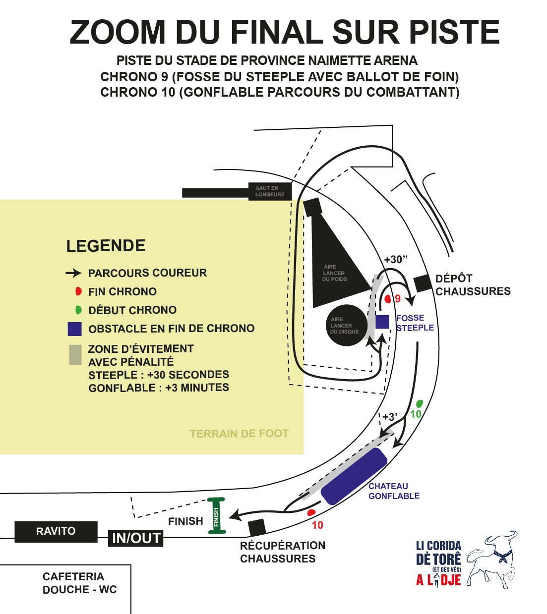 Le tronçon #9 se termine par le passage de la « rivière » ou de la fosse de steeple sur la piste d’athlétisme, qui peut être évitée moyennant 30 secondes de pénalité. Rassurez-vous, la barrière a été remplacée par des ballots de foin. Mais, comme lors d’un 3.000 steeple à la TV, il y aura bien de l’eau dans la fosse. La majorité des participants franchissent la rivière sans trop de soucis mais … n’oubliez pas de faire un grand pas ou de sauter sinon il y aura un peu plus d’eau que prévu. Et prévoyez peut-être une paire de chaussures de rechange.