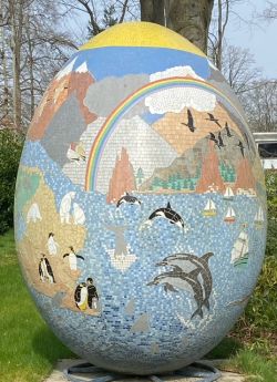 Waar is het te vinden? Welke kunstenaar heeft het gemaakt? Hoe groot is het en hoeveel mozaïeksteentjes zijn er voor dit ei gebruikt? Je mag schatten.