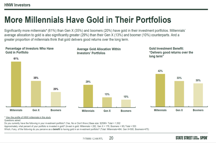 Another wild piece of information, referenced in the chart above from State Street Global Advisors is related to allocations of gold. Interestingly, among high-net worth investors with at least $250,000 in investable assets, substantially more Millennials own gold in their portfolios than Gen X or Boomers!