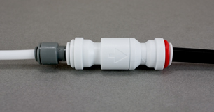 The white tube is the drain coming from your RO unit. The black tube connects to the drain saddle on your drain pipe. Fittings are John Guest-style Quick Connect.