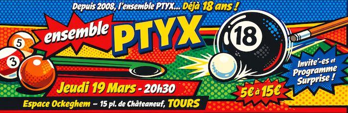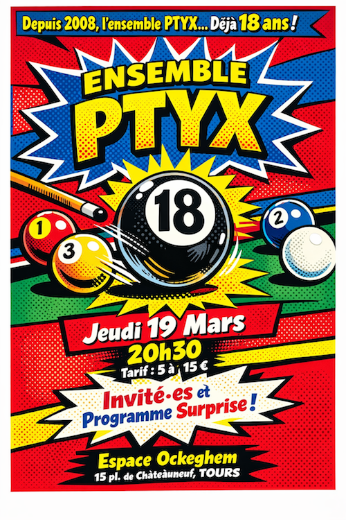 Depuis 2008, l’ensemble PTYX cultive un goût pour les formats de concert inventifs, où l’écoute se vit autant comme une expérience musicale que comme un moment partagé. Pour célébrer ses 18 ans, le collectif imagine une soirée anniversaire à son image : généreuse, curieuse et résolument vivante.