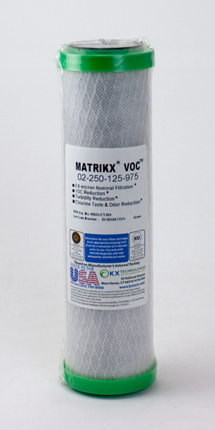 The MatriKX VOC coconut shell carbon block pictured on this page is one of the many superior cartridges available for use in multi-cartridge filters. The VOC is made with micro-pore coconut shell carbon in a tight 0.6 micron format. It’s a great chlorine reducer, a fine all-around chemical filter, an excellent taste enhancer, and is especially good at removing the disinfection by-products known as THMs.