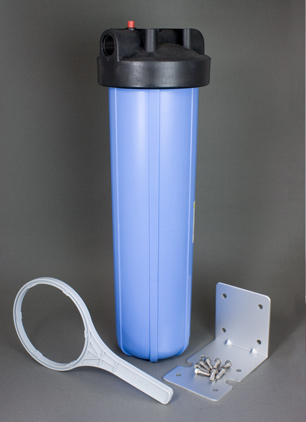 The "20 inch Big Blue" housing accepts 4.5" X 20" cartridges, a standard size, so many filtration options are available. The housing works with radial flow cartridges, where water flows from the outside of the cartridge to the center (carbon block and sediment filters) or axial flow cartridges, where water flows the full length of the cartridge from bottom to top ("media" cartridges with granular carbon, iron removal media, KDF, softening resin, pH amenders, etc.).