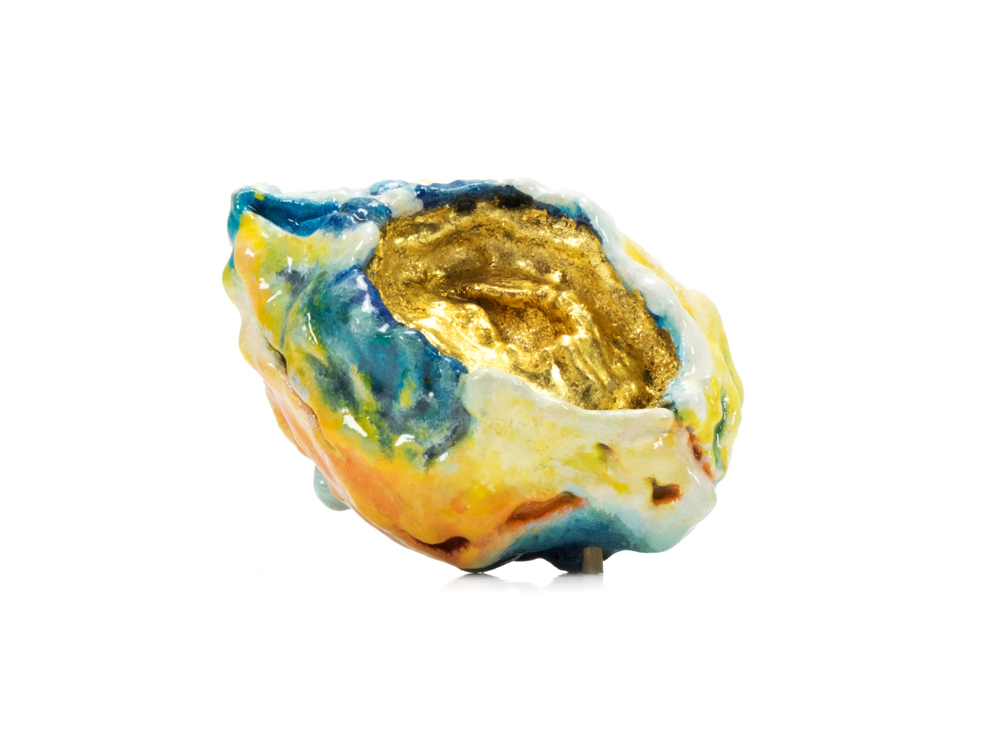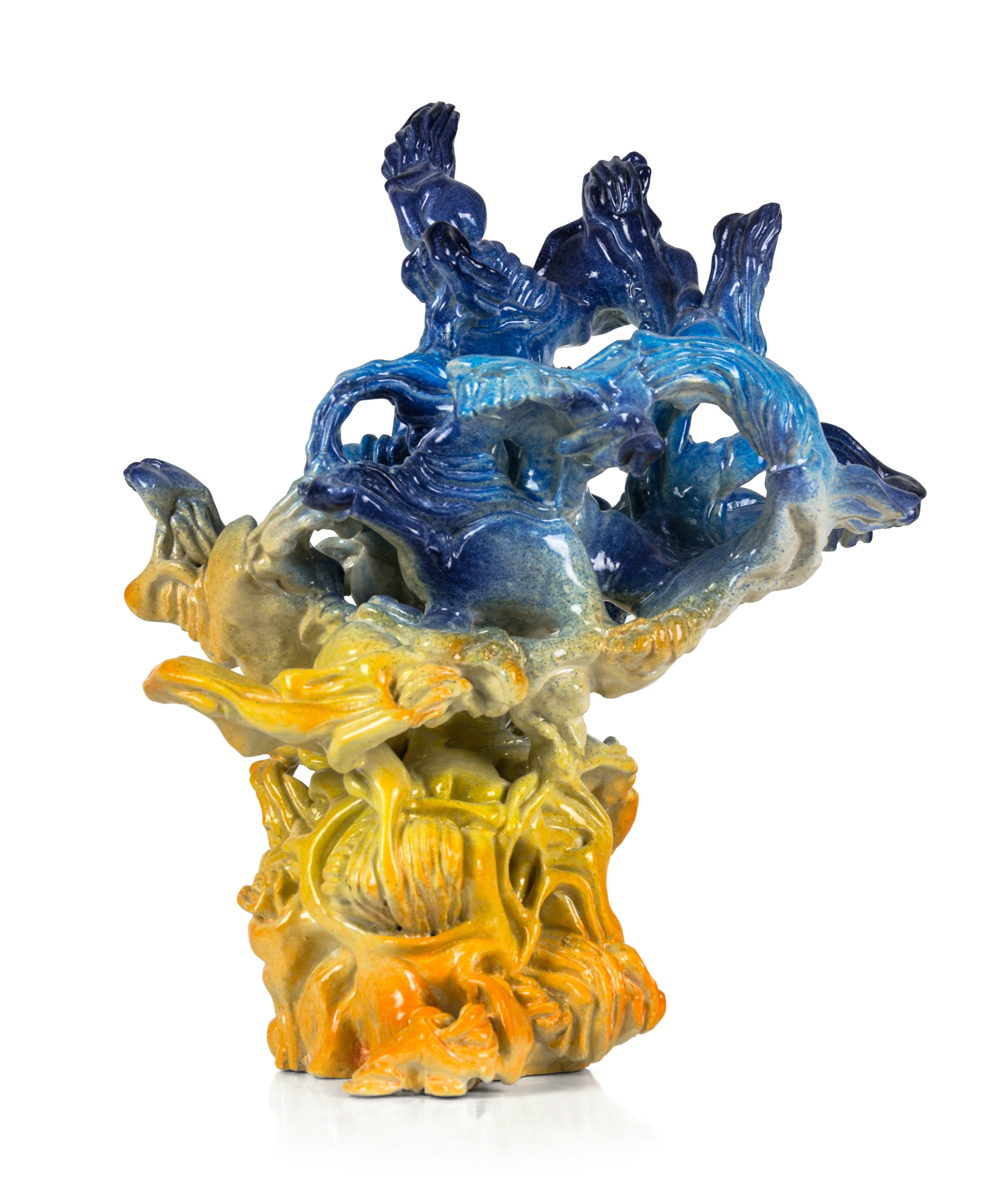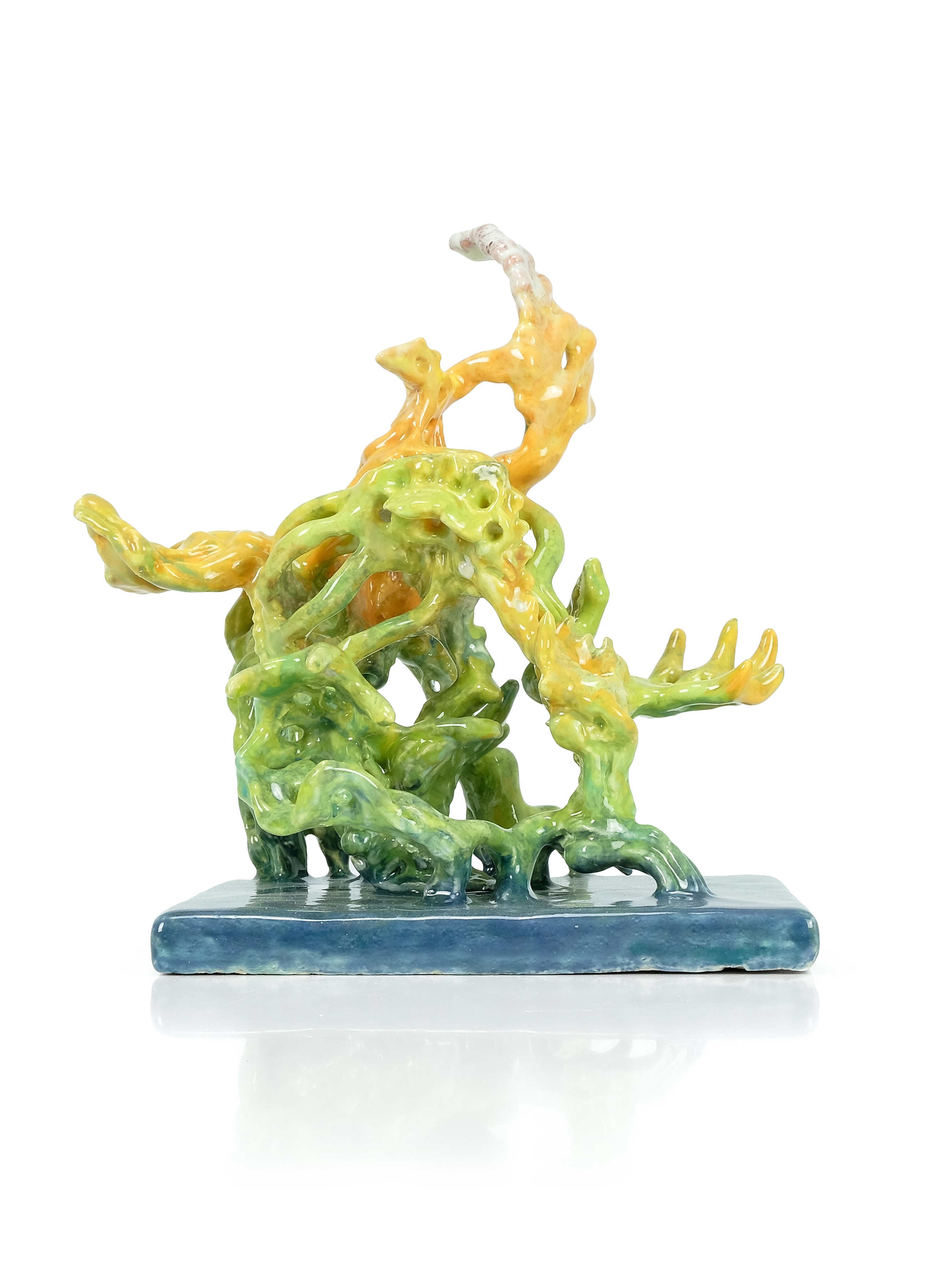 In his ceramic works, Nick uses 3D experiments to explore ideas of both organic (references to nature and food) and genetically engineered life forms. Gonshi rocks and Ikebana are also a source of inspiration. Nick Ervinck, aims to let architecture and sculpture meet, with focus on shape and lines, and of course colours. With these sculptures, he investigates how to use today’s techniques to transcend or continue the craftsmanship of the past. The ceramics shock their spectator with a strong expressiveness. The overwhelmingly powerful colours influence the perception to the extent that the forms can no longer be interpreted within a contemporary framework.