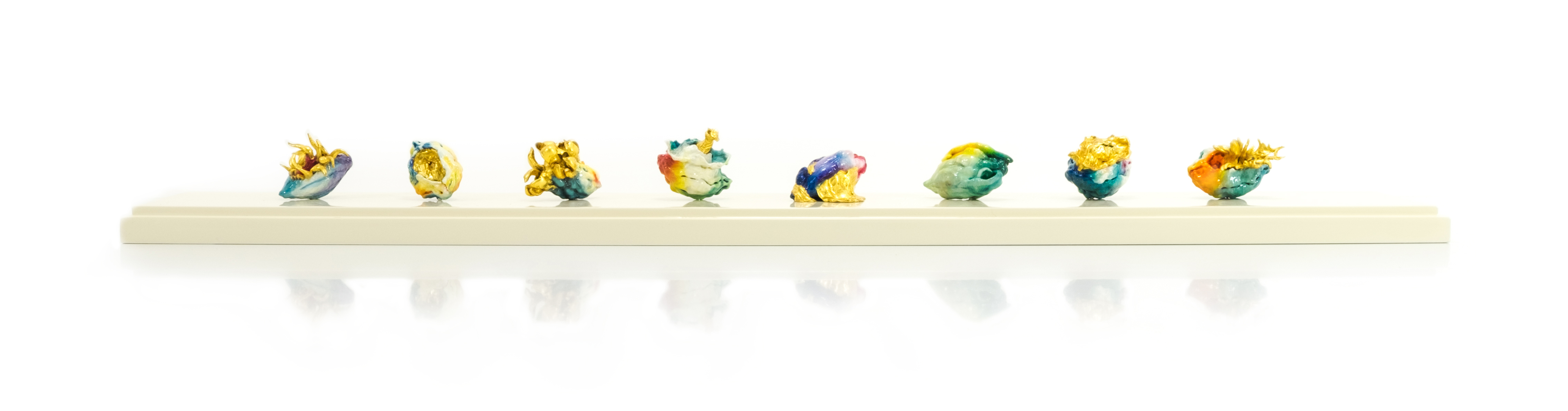 In NEBKATROBS, mutated cacao beans are partially covered in gold. They look like objets trouvés collected in a cabinet of curiosities. Or fruit, sea creatures, shells, from a future world of beautiful mutations. But when the viewer looks more closely, other details start to emerge: teeth, tentacles, flesh. Once more, Ervinck reveals the dark, ominous depths under the shiny surface. |