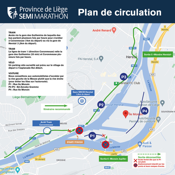 Pour ceux qui viennent via la sortie d’autoroute « pont barrage/Jupille » (rive droite de la Meuse) le « tourne à gauche » après le pont barrage sera interdit dès la formation de file pour éviter que celles-ci ne remontent vers l’autoroute. Attention, sur l’île Monsin, il ne sera pas possible de se garer à deux endroits délimités par des cônes à gauche de la chaussée venant du pont barrage car l’accotement est réservé pour l’évènement (les coureurs).