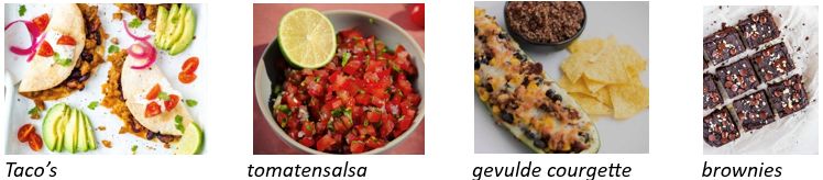 Bijvoorbeeld krokante taco’s met kip, rund of half om half gehakt, maar dan zonder frituren. Of gevulde courgettes met gehakt, bonen en mais en een schaaltje salsa ernaast. En tot slot, geloof het of niet, heerlijke brownies van zwarte bonen. Denk niet dat dat niet lekker is, het tegendeel is waar. Zwarte bonen zorgen voor de smeuïge, vaste kleverige textuur die bij een brownie past. De suiker is vervangen door verse dadels waardoor deze brownie lekker zoet wordt maar niet té. Samen met wat pure chocola is dit een “gezonde” lekkernij om U tegen te zeggen.
