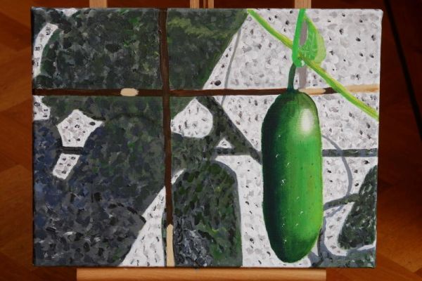 Gelukkig heeft zijn vrouw Carla gedurende de wintermaanden de zomerse sfeer nog weten te vangen met een schilderij van een zonovergoten komkommertje uit eigen tuin.