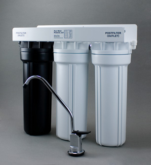 The standard-sized undersink filter above accepts three standard-sized cartridges. This arrangement offers both volume and variety. Standard-sized cartridges are sold in a competitive environment, which promotes both quality and economy.