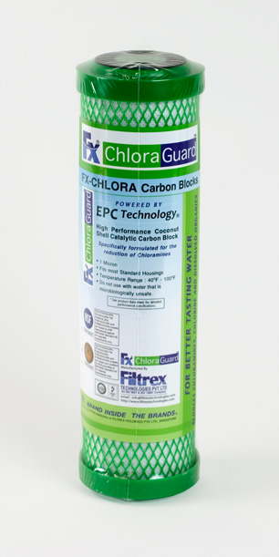 Above is the latest addition to our standard-sized carbon block selection. We've added two new Filtrex coconut shell carbons. Above is the ChloraGuard model, a coconut shell catalytic carbon block filter for chlorine, chloramine, and general chemical reduction. See details on our page and on the manufacturer's spec sheet.