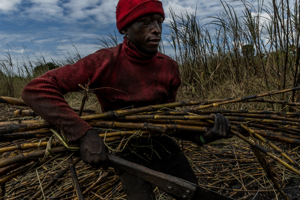 In the Kilombero corridor, a farm worker cuts sugar cane in a field that has been set alight to scare away snakes and facilitate access to a cleared field