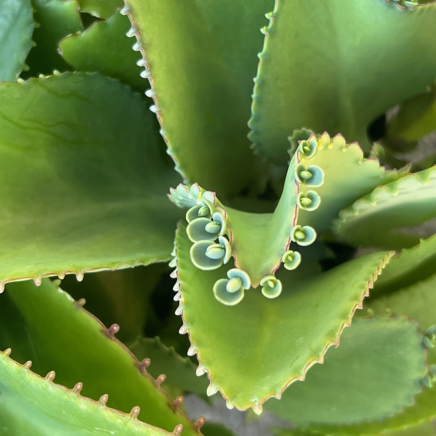 Kalanchoe pinnata is an easy to grow succulent that propagates from plantlets that grow on the leaf margins. It likes at least 1/2 a day sun and watering when completely dry. It has outrageously beautiful flowers in the winter time lasting for months.