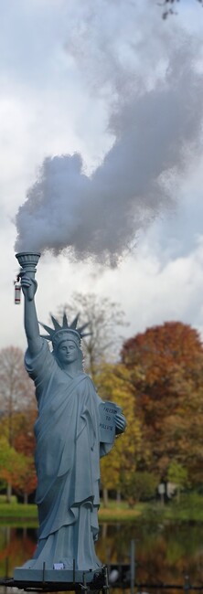 Nações e ONGs temem abordar abertamente o tema de como lidar com Trump e suas políticas, receosas de tarifas, cortes de verbas, deportações e outras medidas semelhantes. Como ateliê de arte independente, não estamos limitados por tais amarras. Esta escultura foi criada para abordar "o elefante na sala" e iniciar um debate necessário sobre como os EUA estão destruindo a única chance do mundo de combater a catástrofe climática, bem como sobre como se opor a ele.