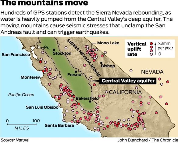 For the past 150 years, they report, periodic pumping from the aquifer has caused the towering Sierra to rebound upward as much as 150 millimeters, or about 6 inches. At the same time, they note, California's Coast Range, which spans 400 miles from Humboldt to Santa Barbara counties, has grown, although by much less.