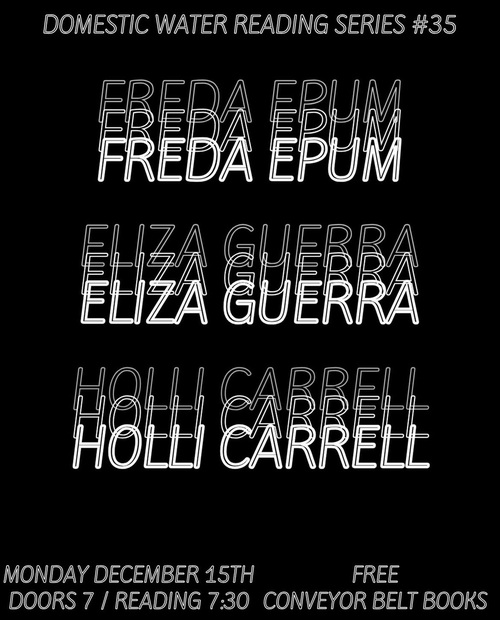 reading at 7PM, food and wine available, curated by
