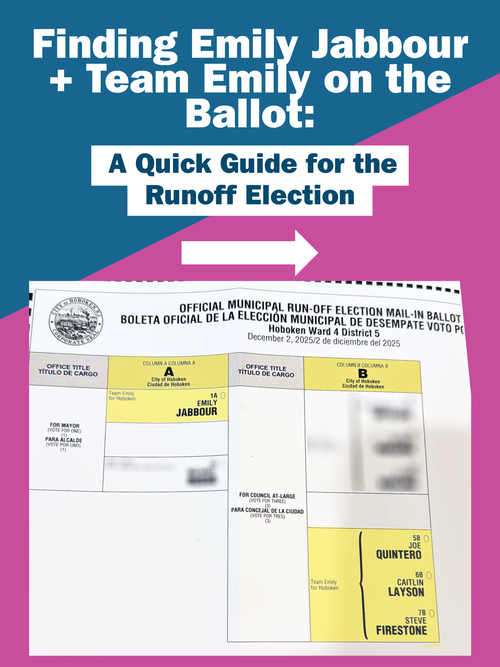 Emily Jabbour and the Team Emily slate finished first in the November 4th election. But we need to turn out tomorrow, when Hoboken’s future will be decided. Emily and the Team Emily slate, Joe Quintero, Steve Firestone and Caitlin Layson, offer the steady, responsible, people-focused leadership Hoboken needs.