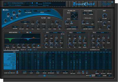 PowerChord is a unique guitar plugin that allows you to create fantastic PowerChord grooves and lots more! Instead of using a sampled loop, you can create your own groove sequences with PowerChord or use the many presets with their grooves that are already included inside this creative instrument.