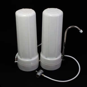 A double countertop filter can be an effective fluoride remover when one housing contains a fluoride removal cartridge and the second contains a carbon block cartridge.