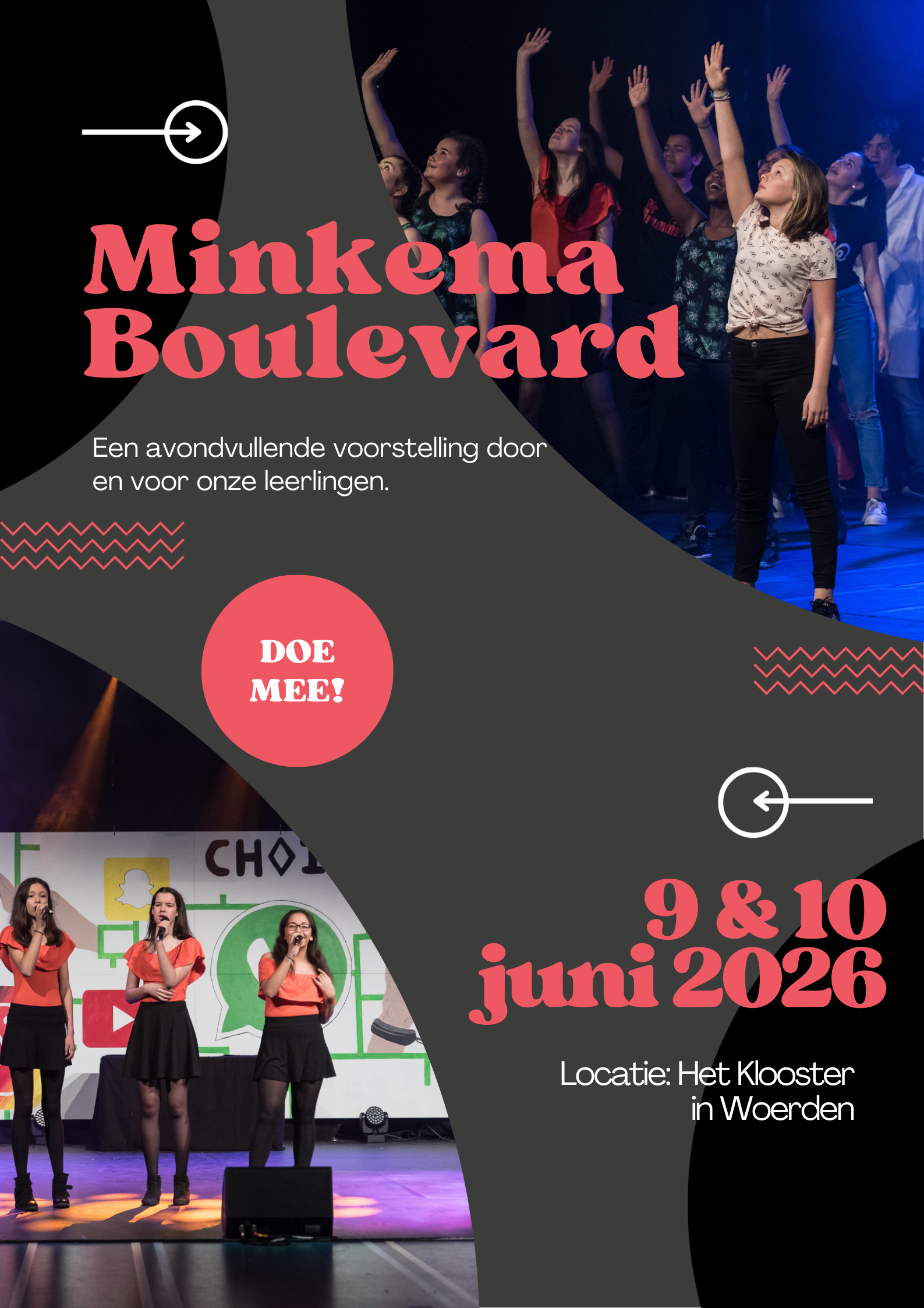 Na de kerstvakantie beginnen de repetities voor de nieuwe editie van Minkema Boulevard! Leerlingen uit leerjaar 1 t/m 3 kunnen deelnemen aan dit traject, dat wordt begeleid door docenten van Het Klooster. De lessen vinden op dinsdag plaats op school.