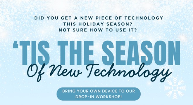 Did you get a new phone, tablet, or laptop for the holidays? If you're stuck staring at a set up screen or struggling with settings, then join us on Thursday, January 15, from 6pm-7pm for a relaxed, open learning lab! Get help setting up emails and accounts, adjusting settings, transferring data, and anything else you may need to take full advantage of your new technology. Make sure to bring your device and any email or account log in information you may need. Registration is not required as this program is drop in and not by appointment.