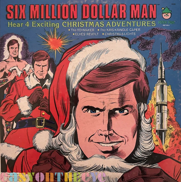 [3] The Six Million Dollar Man – 4 Exciting Christmas Adventures. Issued in 1978, this was an unashamed Christmas cash-in featuring exactly NONE of the original TV series actors! Still if you know the show, and want to imagine Steve Austin using is bionic powers to put down the Elves Revolt, look no further! The label, Peter Pan, did zillions of children's Christmas singles early doors but in the 1970s latched on to the idea of licensing comic and TV characters, everything from Batman to Star Wars, to front pacey short stories. But this is the only one with the star stripping off on the front cover and the phallic rocket taking off! Lucky Mrs. Austin.