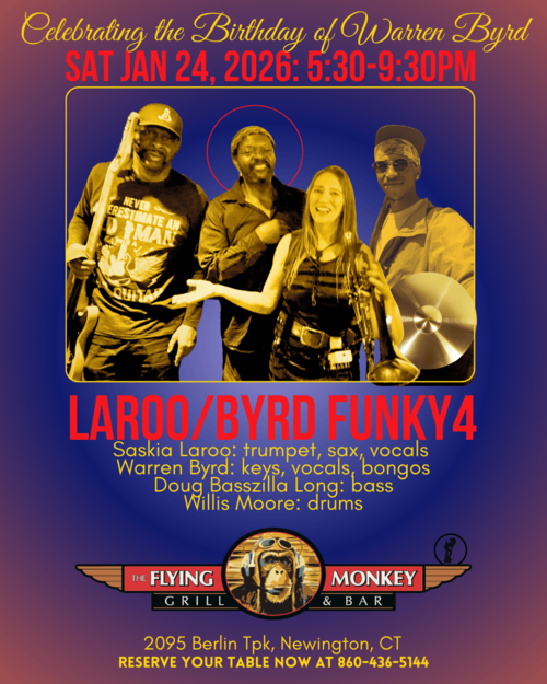We’re excited to invite you to a very special evening of live music, groove, and celebration as we honor the birthday of Hartford native Warren Byrd with a funky, spicy performance by Laroo/Byrd Funky4 at The Flying Monkey Grill & Bar in Newington.