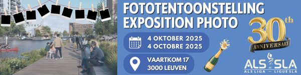 Cette année, La Ligue SLA souffle ses 30 bougies, une étape que nous aimerions célébrer avec vous ! Le samedi 4 octobre, nous organisons une journée portes ouvertes dans nos bureaux du Vaartkom de Louvain, dans le cadre de la réouverture officielle et festive du nouveau Vaartkom par la ville de Louvain. Nos portes seront ouvertes ce jour-là pour tous ceux qui souhaitent nous (re)découvrir. Dans notre exposition photo, nous revenons sur trois décennies d'engagement en faveur des personnes atteintes de la SLA et de leurs proches, et sur notre combat pour une meilleure sensibilisation et pour la recherche.