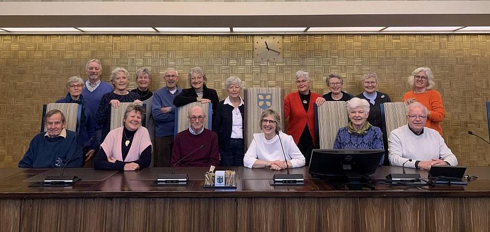 De cursus voor nieuwe inwoners is weer afgelopen. Traditiegetrouw vond de laatste bijeenkomst plaats in het raadhuis. Waarbij de groepsfoto genomen wordt als de groep plaatsneemt op de stoelen van het college van burgemeester en wethouders. Wethouder Gerben van Voorden was deze laatste keer de inleider. En de Gooi-en Eemlander kwam langs, dus later deze week komen enkele van de mensen van de foto aan het woord in de krant.