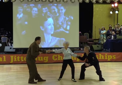 Tenslotte een geweldig dansnummer met in de hoofdrol Jean Veloz, die op 93-jarige leeftijd een dans doet herleven, die ze in een film, in 1943, heeft uitgevoerd. Tegelijkertijd zien we op het scherm de oorspronkelijke opname. Het dansen begint na 3 minuten introductie. Tik op het scherm en trek het rode bolletje onderaan over de lijn naar rechts, tot je bij 3 minuten bent.